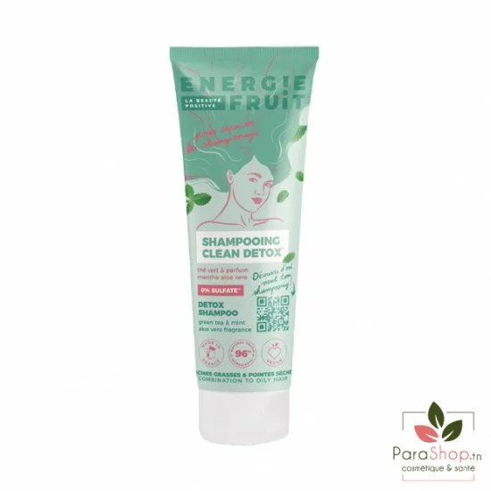 ENERGIE FRUIT SHAMPOOING CLEAN DETOX ; Spécialement conçu pour les cuirs chevelus à tendance grasse et les cheveux aux pointes sèches, ce shampooing clean detox allie purification intense et respect du film hydrolipidique capillaire.